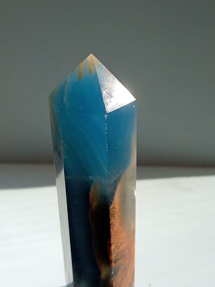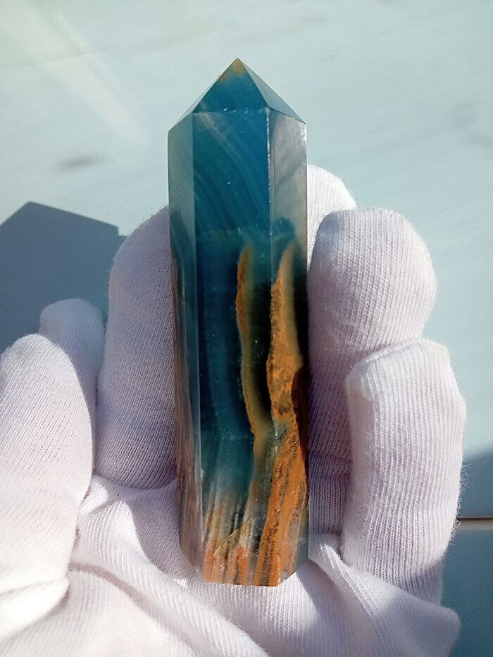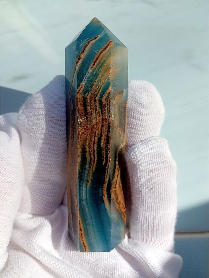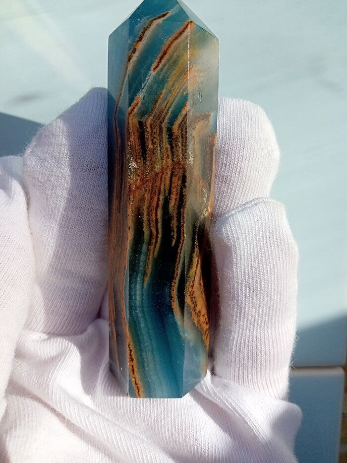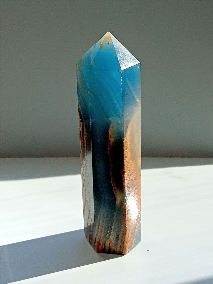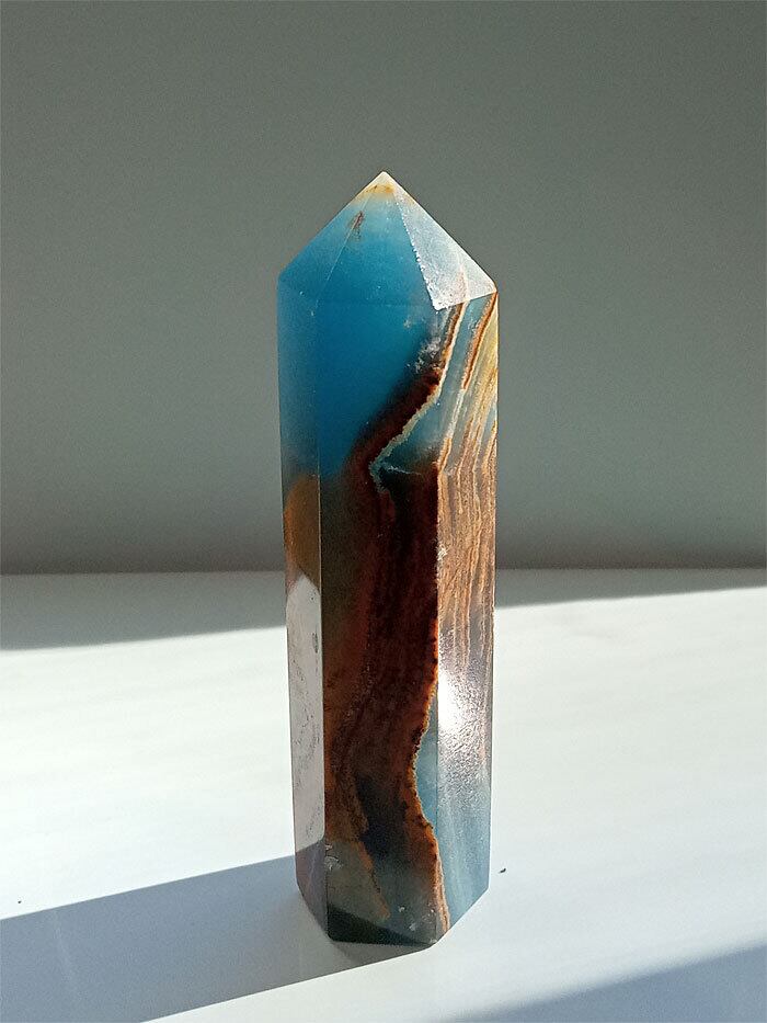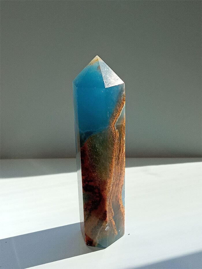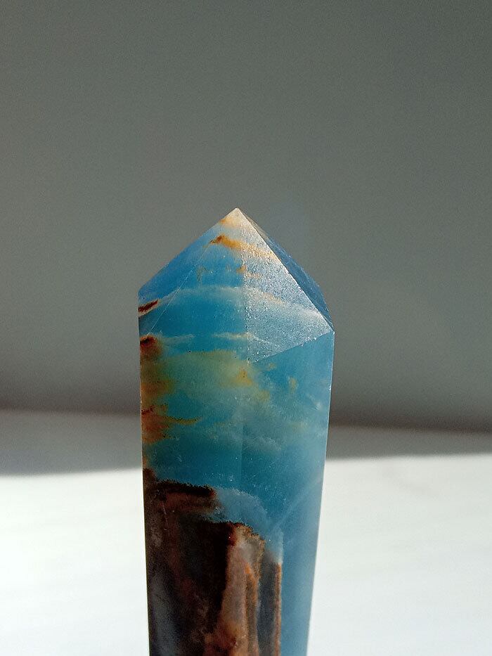このレムリアン アクアティン カルサイト オベリスク水晶は、まるでレムリアの海と大地が宿るかのよう。青みがかった海のような色合いとカルサイト特有の透明感が、心を穏やかに包み込みます。手のひらにすっぽり収まるサイズ感と、磨き仕上げの光沢が、存在感を放ちます。